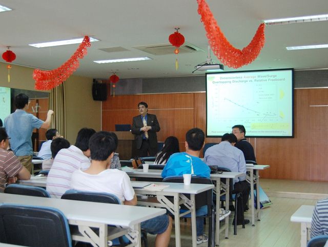 6月5日,杰克逊州立大学土木与环境工程系主任Farshad Amini教授应邀来到北京赛车PK10 ,在严恺馆702就海堤溢流溃堤、海堤坡面防护等方面的研究为北京赛车PK10 师生做了一场学术报告。本次报告主要介绍了三种海堤背水坡的保护系统(碾压混凝土 Roller Compaction Concrete、铰接式护坡砖 Articulated Concrete Blocks、高性能加筋草皮 High Performance Turf Reinforcement Mat)溢流和波浪溢流的大型物理试验的研究成果。该试验是在美国俄勒冈州立大学的波浪研究实验室内进行的原物尺寸的水槽实验,消除了前人使用小尺度海堤引起的尺度效应。通过试验,对每一种海堤保护系统上发生溢流和波浪溢流时的详细水力学数据(包括流量、流速、水深、波浪特征等)给出了预测方法,对海堤保护系统表面的侵蚀特征做出了总结;并对三种海堤保护系统的水力学表现进行比较,给出了三种海堤保护系统的保护作用的评估。