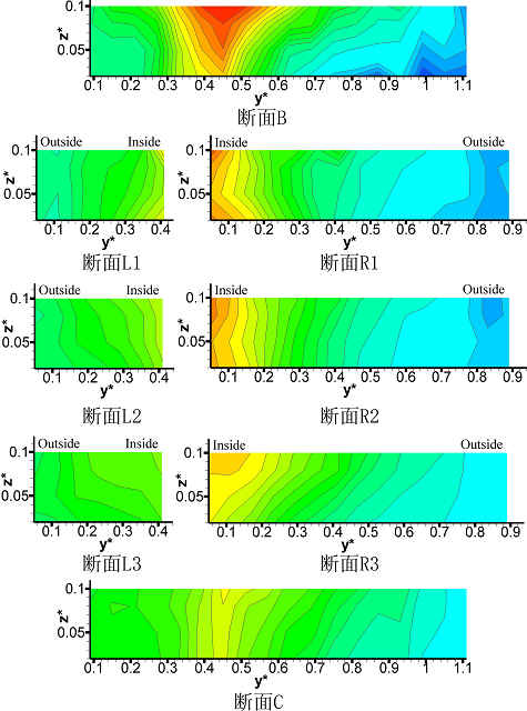 分汊水流与污染物输移机理的试验研究。探索了不同分汊角度、汊道宽度比和上游来流条件下分汊流动的水流紊动结构,揭示了污染物在分汊水流中不同分汊形态、上游断面不同离岸排放位置下的穿越过程、混合率和分配规律等方面的差异特征;建立了污染物在分汊河道中分污比与分流比的半经验半理论函数关系式。