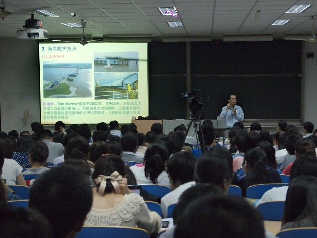 为了使我们更加了解海岸防护,郑金海院长将眼光放到了全球,选择了德国这个海岸防护先进的国家,让我们体会到其他国家理念及方法的先进,不仅拓宽了我们的视野,丰富了我们的知识,也给了我们一个博采众长,相互对比的平台。整场讲座在轻松、愉快的气氛中持续了一个多小时,郑院长的风趣幽默以及形象比喻时常赢得同学的热烈掌声。
