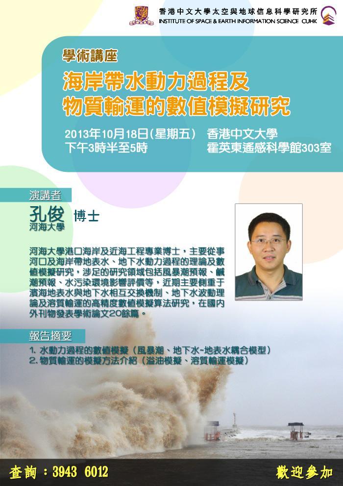 2013年10月18日,北京赛车PK10 孔俊副教授应香港中文大学太空与地球信息科学研究所邀请,在香港中文大学开展学术讲座《海岸带水动力过程及物质输运的数值模拟研究》。孔俊副教授长期从事河口及海岸带地表水、地下水动力过程的理论及数值模拟研究,涉足的研究领域包括风暴潮预报、咸潮预报、水污染环境影响评价等,近年来侧重于滨海地表水与地下水相互交换机制、地下水波动理论及水体中污染物输运的高精度数值算法研究,在国内外刊物发表学术论文20余篇。本次讲座,孔俊副教授对其近年来提出的高精度物质输运模拟算法“A High-resolution method for the depth-integrated solute transport equation based on an unstructured mesh”和地表水—地下水整体模型“A new model for coupling surface and subsurface water flows: With an application to a lagoon” 进行了宣讲,并与中大科研人员就下阶段的合作进行了深入交流。