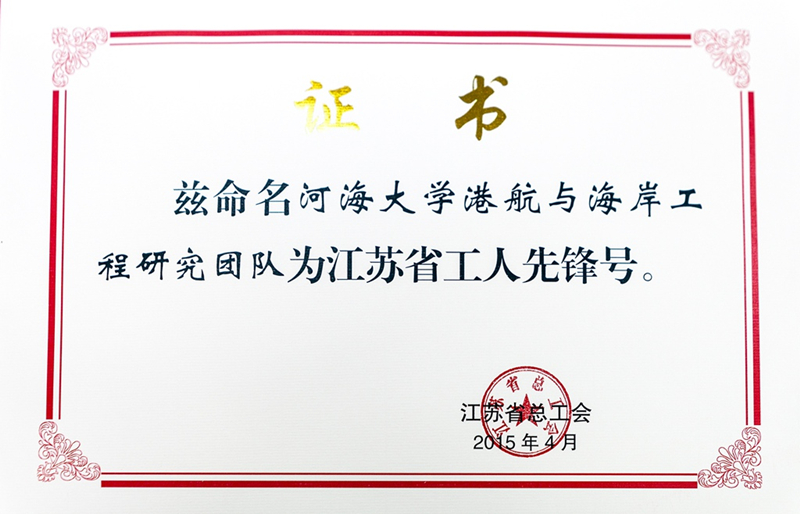 经江苏省教育科技工会推荐,北京赛车PK10 港航与海岸研究团队获得“江苏省工人先锋号”荣誉称号,特此报喜!