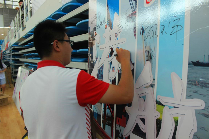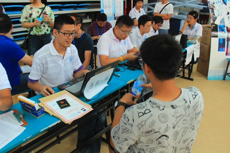 的迎新接待点,一早就有大二志愿者的守候,他们面带微笑,用饱满的热情和认真的态度,迎接每一位到来的新同学,安排新生签到、发放材料袋、提醒日程安排、引导新生入住……温暖的笑脸、耐心的解答、亲切的交谈、热心的帮助,使得新生及新生家长倍感亲切和温暖。在注册点,大二的志愿者们有条不紊地协助2015级各班班导师进行新生注册工作。注册完成的新生们纷纷在签名板上贴上自己的照片,构成“港航”二字,签名并与照片墙合影,以此来记录自己告别高中、正式步入大学的开始。
