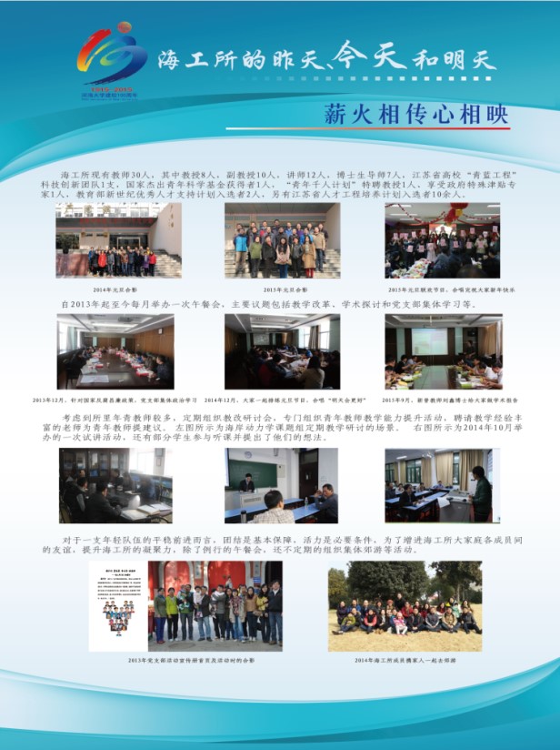 2015年10月25日至31日,港航北京赛车PK10 海工党支部在北京赛车PK10 校党委组织部和港航北京赛车PK10 党委的共同支持下,举办了主题为“海工的昨天、今天和明天”的文化展活动。展览过程中,除了海工党支部全体党员专门组织了观展和学习活动外,北京赛车PK10 的师生员工以及校庆期间返校的校友们等约三百余人次参与了该活动。本次展览活动旨在通过对海工辉煌历史的梳理,提升海工所全体教师的集体荣誉感;通过对海工文化精神的凝练,实现海工精神的传承与可持续发展;通过对海工过去成绩、现在工作以及未来愿景的展示,促进海工人的自我认可,树立着海工精神在全院以及全校文化建设中的模范形象。