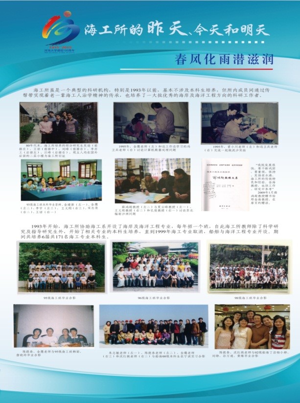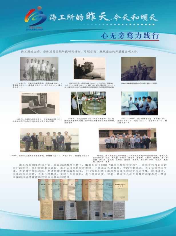 该展览由“前言”、“昨天”“今天”、“明天”和“后记”五个板块组成。“前言”中详细记述了海工所自1979年由水利部批准组建发展至今的历史沿革,明确了校庆期间组织本次文化展的定位和意义。“昨天”板块由“海洋攻关自请命”、“心无旁骛力践行”、“春风化雨潜滋润”和“报得春晖功渐成”四个展板组成,展示了海工所历史发展过程中,特别是海工所发展初期老一辈海工人在为我国海岸及海洋工程事业发展及人才培养等方面表现出的努力拼搏的精神、勇于担当的气魄和高瞻远瞩的智慧。“今天”板块由“薪火相传心相映”和“硕果累累事业兴”两个展板组成,展示了海工所近五年在人才培养、科学研究、服务社会已经团队建设等方面的主要成绩,也展示了海工所全体同仁团结友爱的融洽气氛、乐观向上的积极心态和井然有序的前进势态。“明天”板块由“新人应有新气象”和“大哉海工奔前程”两个展板组成,展示了海工所未来重点发展的学科方向已经发展愿景,展现了现代海工人继往开来的决心和稳步前进的信心。“后记”板块再次强调了本展览在回顾历史、总结现在和展望未来中的作用,并对包括提供历史资讯的老一辈海工人等所有为本次展览活动付出辛苦努力的人和组织表达了最真诚的谢意。