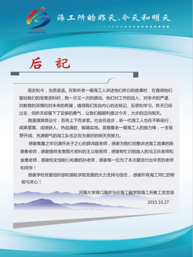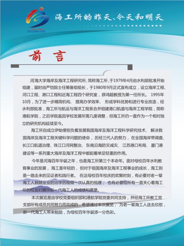 该展览由“前言”、“昨天”“今天”、“明天”和“后记”五个板块组成。“前言”中详细记述了海工所自1979年由水利部批准组建发展至今的历史沿革,明确了校庆期间组织本次文化展的定位和意义。“昨天”板块由“海洋攻关自请命”、“心无旁骛力践行”、“春风化雨潜滋润”和“报得春晖功渐成”四个展板组成,展示了海工所历史发展过程中,特别是海工所发展初期老一辈海工人在为我国海岸及海洋工程事业发展及人才培养等方面表现出的努力拼搏的精神、勇于担当的气魄和高瞻远瞩的智慧。“今天”板块由“薪火相传心相映”和“硕果累累事业兴”两个展板组成,展示了海工所近五年在人才培养、科学研究、服务社会已经团队建设等方面的主要成绩,也展示了海工所全体同仁团结友爱的融洽气氛、乐观向上的积极心态和井然有序的前进势态。“明天”板块由“新人应有新气象”和“大哉海工奔前程”两个展板组成,展示了海工所未来重点发展的学科方向已经发展愿景,展现了现代海工人继往开来的决心和稳步前进的信心。“后记”板块再次强调了本展览在回顾历史、总结现在和展望未来中的作用,并对包括提供历史资讯的老一辈海工人等所有为本次展览活动付出辛苦努力的人和组织表达了最真诚的谢意。