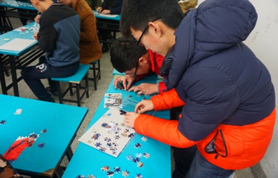 本次活动名称为“默契大比‘拼’”,分为平面拼图和立体拼图两部分,拼的是智慧和手速,也拼的两人的默契和合作能力。班委们提前到达教室布置场地,将完整的拼图进行拆解,以保证公正性,活动开始前,到场同学抽签决定分组,最终确定了15个小组。第一轮是平面拼图,图片均是来自二班同学们在历次活动中的合影以及班徽和校徽。随着班长一声“比赛开始”,同学们都严阵以待,开始拼图。各个小组的拼图方法有所不同,有的从四周和边角开始逐渐向中间靠拢,也有的小组先拼出人脸再根据图片寻找周围的拼图块。从一开始的手忙脚乱、无从下手到后来的愈发默契,整个过程紧张但不失趣味。经过了约40分钟的努力奋战,徐思勇和周荣香小组率先拼出“二班足球队”一图,获得了第一轮第一名,又过了20分钟,各组都基本完成了拼图工作,并把成品镶入到相框中。第二轮的立体拼图是各种军事战车的模型,各组凭借着刚刚培养出的默契,拼图速度都快了很多。经过了仅20分钟,嵇静和阙云龙小组就率先完成立体拼图,夺得了第二轮第一名。经过一番角逐,冠亚季军分别花落各组。活动于下午5时左右结束,结束前同学们高举拼图成果和奖品合影留念。