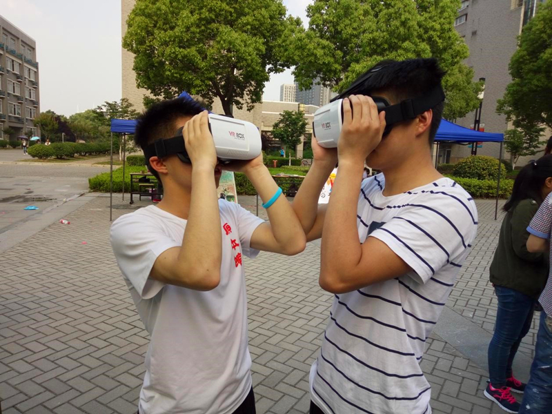 通过任何一关的同学便可获得奖励——体验高科技“VR”。带上VR眼镜的你会仿佛瞬间置身于另外一个空间,并且依旧可以随着你的走动旋转而改变视角,体验全方位的虚拟世界。工作人员提前准备了可以全方位参观侏罗纪公园的历史体验、可以挑战自我虚拟坐过山车的高度体验、让你身处鬼屋寻找出路的恐怖体验等等。在体验负责人赖颖的介绍下,同学们无一不表示惊奇。有因为害怕大叫出声的女生同学,有因为感兴趣想研究原理的计信院同学,还有因为非凡体验想将同学们的眼镜买回去看电影的同学。本次的体验让参与的同学感觉到了人类感官的重要性以及认识到了在全身心置于另一场所所表现出来的真实自己。