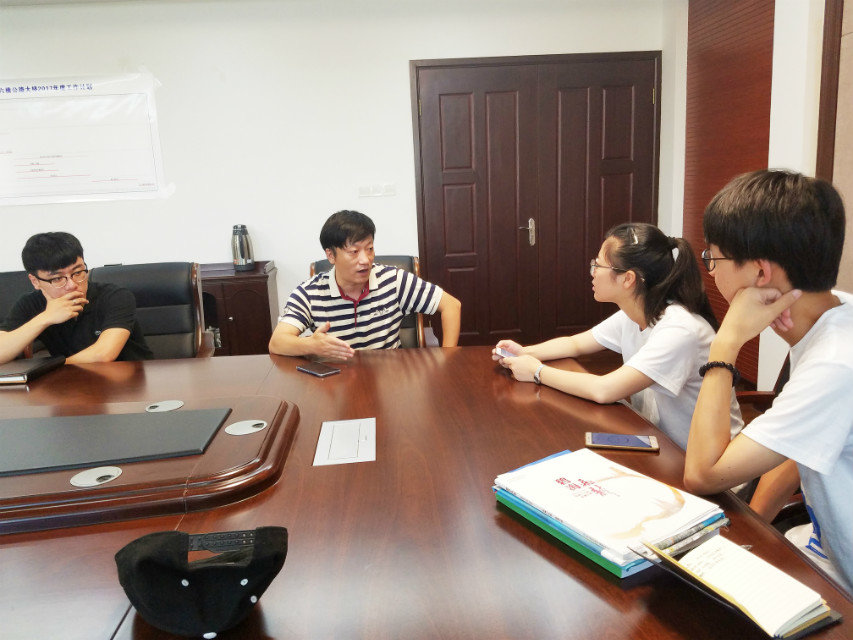 随后,调研团出发前往本次社会实践的第二个地点,岱山岛。抵达目的地后,调研团立即与浙江交工集团鱼山大桥项目经理部取得联系,并驱车前往。大桥项目副经理姚德贵热情接待了调研团成员。队员们在拿到了工程前期策划书后,对环境保护方面的内容进行了讨论、记录。完成后,队员们分别进入到综合科办公室,质检部和工程部开展实习调研,了解了项目部内部的分工运营情况,对施工单位的工作内容有了进一步的认知。