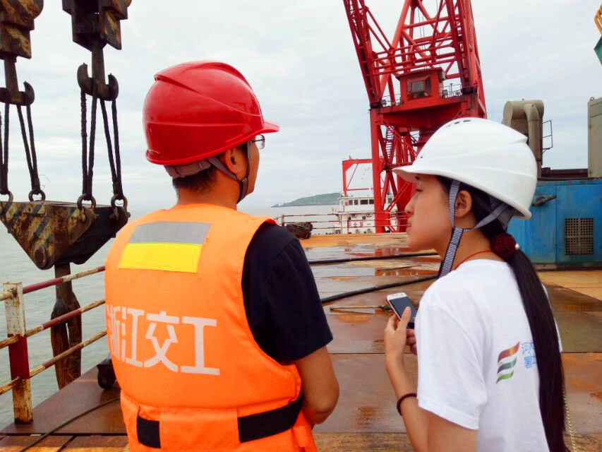 10日上午8时,调研团在鱼山大桥质检部部长刘宏的带领下前往鱼山大桥施工现场进行参观调研。做好安全防护后,刘工便开始向队员们讲解大桥的施工进度和有关技术,包括国内公路工程最大全液压动力头钻机的作业情况,由军工企业斥资六百多万建造的主通航孔桥护栏等。其中最为特别的,鱼山大桥的桥墩均为一体化工程,由材料加工厂统一焊接,再运往大桥施工地直接安装。队员们也向刘工仔细地询问了目前大桥环境问题方面存在的不足,诸如海上作业时废弃物的后续处理,打桩船等各类机器排污、少量漏油的环境问题,之后建议信的书写将针对具体情况具体展开。