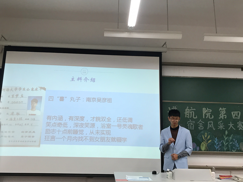 主持人致开场辞后,比赛正式开始。本次比赛共有22个宿舍参加,各宿舍代表依次上台以ppt或短视频的形式介绍本宿舍特色,现场气氛热烈,精彩讲解赢得了大家的阵阵掌声。其中,以《诗经·桃夭》篇为引的“桃之室家”宿舍特色鲜明。精美的折纸作品,清新简单的宿舍布置,干净整洁的宿舍环境,充分体现了同学们的心灵手巧,给观众们留下了深刻的印象。最后,经评委与各宿舍代表投票,选出获奖宿舍。主持人公布现场投票结果,并展示预热活动中的最佳人气宿舍照片。辅导员张同鑫老师上台为获奖宿舍颁奖并合影留念,本次比赛圆满落幕。
