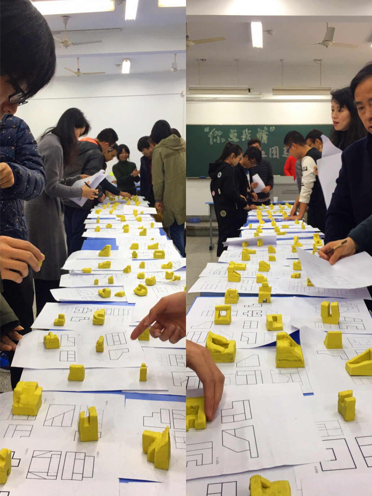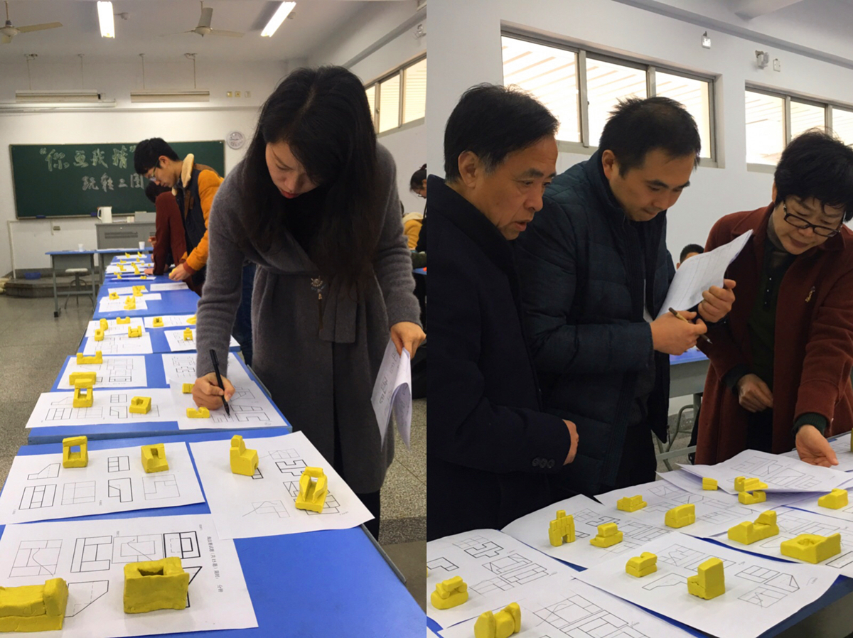 经过前期选拔,十支代表队在现场进行激烈角逐。每个代表队3名成员,分工协作,现场绘制模型的三视图与轴测图,之后根据命题利用橡皮泥、白萝卜等多种多样的材料进行模型制作,在展出时进行解说。制图所四位老师全程指导比赛,并在各环节的评分中严谨细致,精益求精,比赛现场气氛紧张又热烈。通过团队淘汰赛、团队决赛以及个人赛的比拼,最终决出团体和个人的一、二、三等奖。