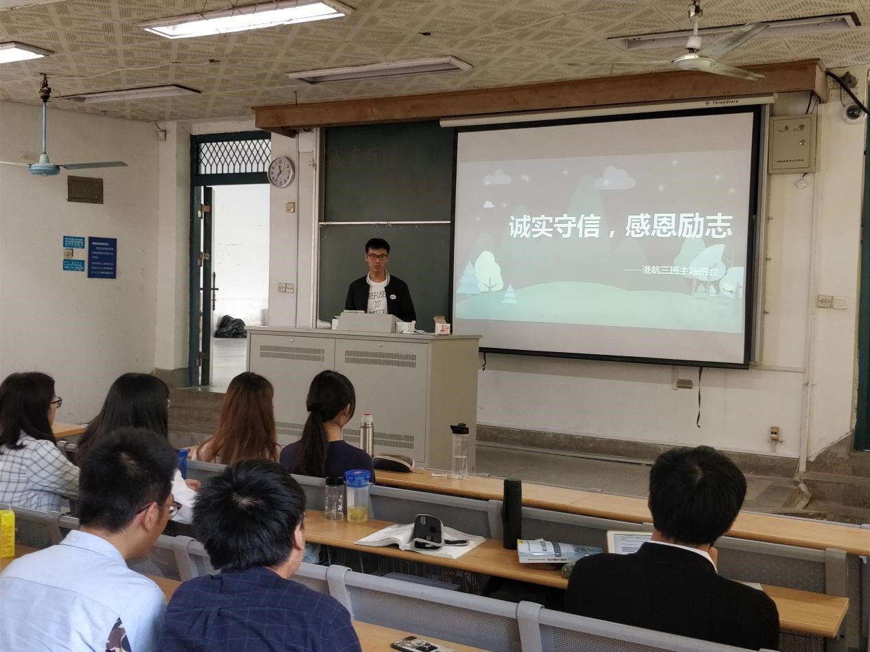 诚信是大学生立身为人,成长成才的必备品质,2015级港航三班于2018年5月10日举办了以“诚实守信,感恩励志”为主题的班会,本次班会由班长丁诚宇主持,参加人员为15级港航三班全体同学。
