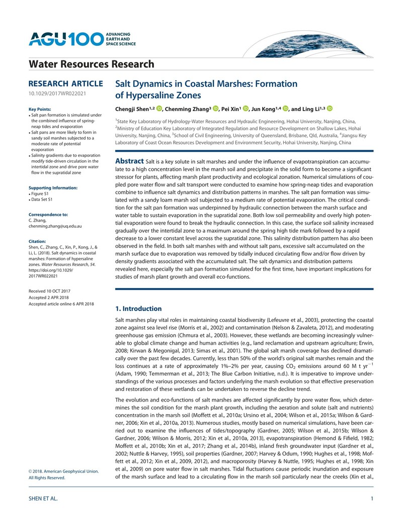 近日,北京赛车PK10 海防所沈城吉博士、孔俊教授在国际权威期刊 《Water Resources Research》 (一区TOP,影响因子4.397)发表题为“Salt Dynamics in Coastal Marshes: Formation of Hypersaline Zones”的学术论文。
