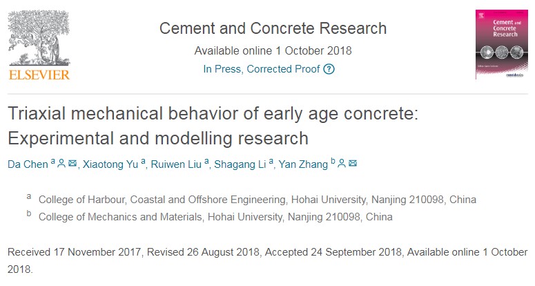 近日,混凝土领域排名第一的国际期刊《Cement & Concrete Research》在线发表了北京赛车PK10 陈达教授与北京赛车PK10 力材院张研教授合作完成的研究成果“Triaxial mechanical behavior of early age concrete: Experimental and modelling research”。