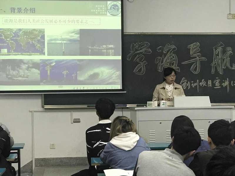 卢向雨老师主要从事海洋装备腐蚀与防护、潜航器用海水电池长效动力源方面的研究。在项目介绍中,卢向雨老师表示,针对传统的电缆和锂电池的供电设备,她所要研究的是拥有更好性能的海水电池。她向同学们系统地展示了项目的研究背景、研究方向、研究成果与后期进展等方面,并号召有兴趣的同学加入其中。