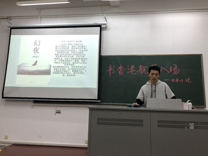 读书交流分享会在18:30准时开始。伴随着主持人黄震同学简单的开场白,谭炜耀、黄震、温世玮、唐琬婷、韩大磊等同学一同为同学们介绍了《人间失格》。而后,尧红成、陈鹏、夏富政同学对于《解忧杂货铺》的独到见解,也让我们每一个人感受到了东野圭吾不仅是推理大师,更有体现人间温情的一面,让每一位同学都为之动容。