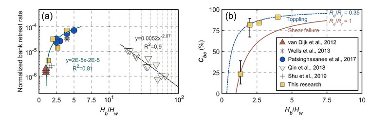 该研究围绕岸壁坍塌机理,通过物理模型手段探究了岸壁高度和近岸水深对坍塌模式、坍塌贡献和边壁后退速率的影响。实验结果表明绕轴崩塌和剪切破坏可以通过岸壁高度和近岸水深的比值进行预测。随着该比值的增大,边壁后退速率和坍塌贡献也随之增大。本研究丰富了海岸动力学与泥沙运动力学,对海岸带资源与环境等学科交叉发展具有重要的意义。