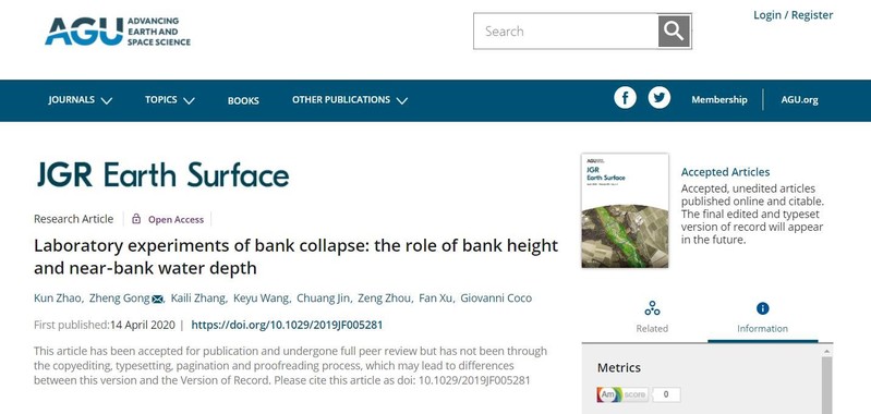 近日,北京赛车PK10 潮滩动力地貌研究团队博士生赵堃在地貌学权威期刊《Journal of Geophysical Research: Earth Surface》(一区Top, 2019年影响因子4.25)上发表了题为Laboratory experiments of bank collapse: the role of bank height and near-bank water depth的学术论文,是继该团队在知名刊物《Geomorphology》和《Water Resource Research》发表岸壁坍塌相关研究后的又一突破。论文第一作者为北京赛车PK10 赵堃博士生,合作作者包括龚政教授、张凯丽博士生,王客予硕士生,周曾教授,以及新西兰奥克兰大学靳闯博士,Giovanni Coco副教授和华东师范大学徐凡博士。
