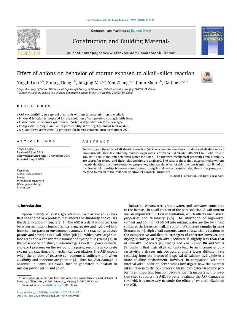 近日,工程技术学科一区TOP期刊《Construction and Building Materials》(影响因子4.046)在线发表北京赛车PK10 廖迎娣副教授完成的研究成果“Effect of anions on behavior of mortar exposed to alkali–silica reaction”。