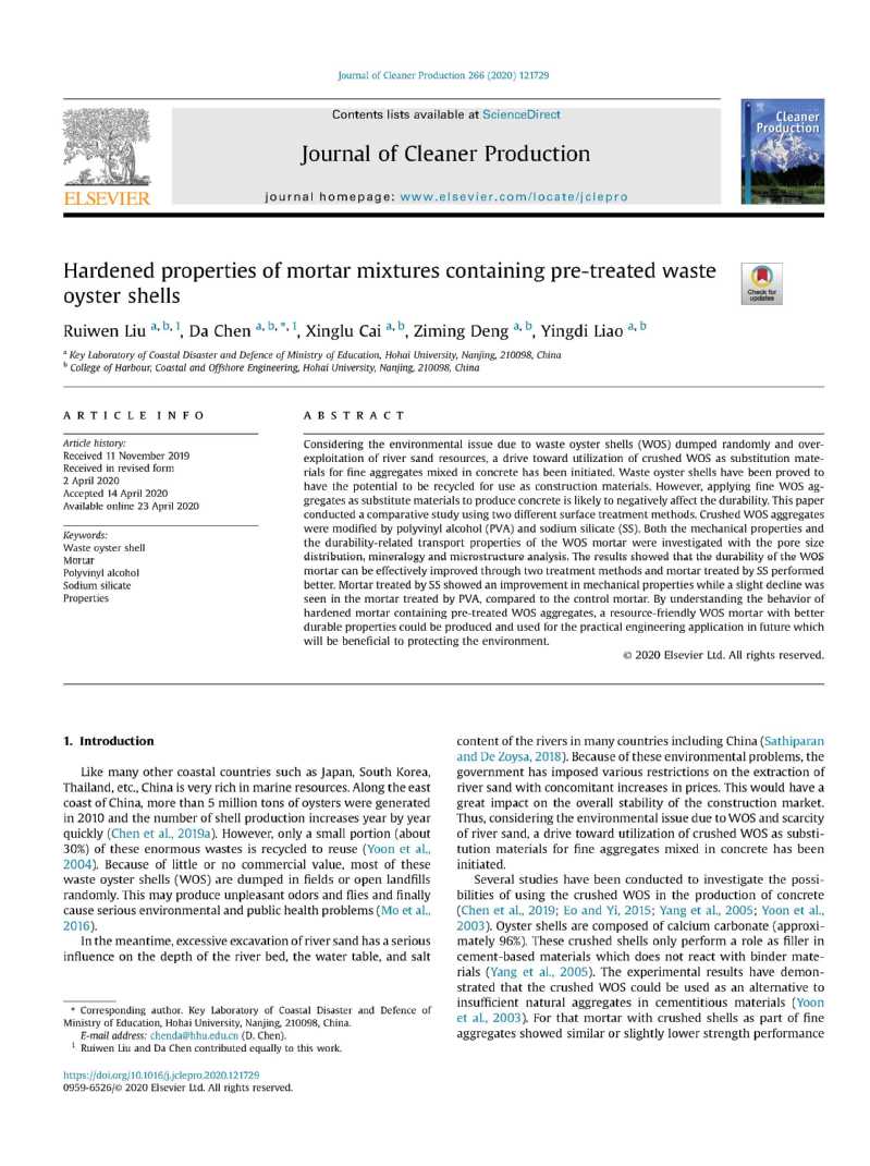 近日,北京赛车PK10 陈达教授指导的博士研究生刘睿文在ESI工程学国际排名Top30的权威期刊《Journal of Cleaner Production》(一区Top,影响因子6.395)上发表了题为“Hardened properties of mortar mixtures containing pre-treated waste oyster shells”的学术论文。