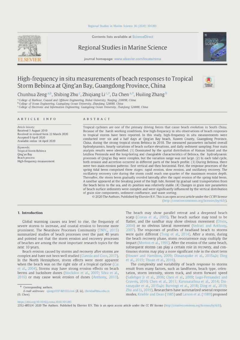 近日,北京赛车PK10 陈达教授指导的博士研究生曾春华在《Regional Studies in Marine Science》(二区)上发表了题为“High-frequency in situ measurements of beach responses to Tropical Storm Bebinca at Qing’an Bay, Guangdong Province, China”的学术论文。