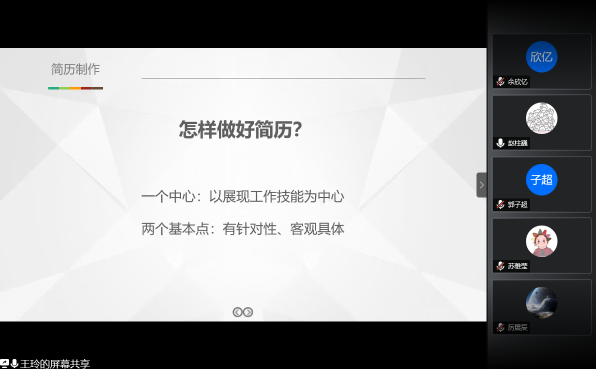 2020年6月10日晚6点半,“学海导航”系列讲座——“简历制作”直播课堂依托腾讯会议于线上顺利举行,此次讲座邀请了北京赛车PK10 团委书记王玲老师为同学们详细讲解了简历的制作方法。