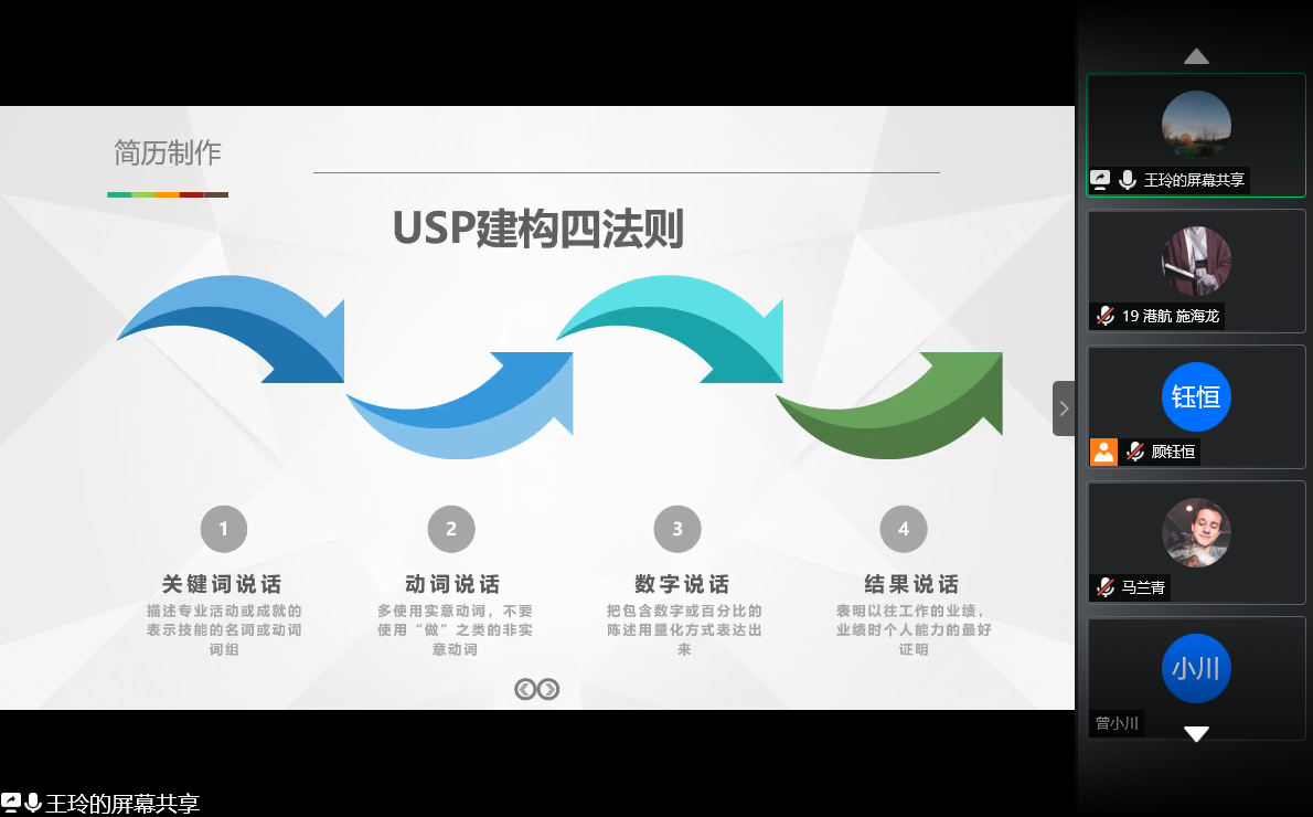 王玲老师以商业运营模式为喻介绍了简历的定义和作用,从简历的内容和包装两个方面阐述了如何做好一份简历。她将做好简历的方法概括为“一个中心,两个基本点”,并详细介绍了个人信息、求职目标、教育背景等六个简历的常见模块,指导同学们需围绕“USP建构四法则”来组织简历中的语言,以达到用最有效的信息展现出独特有用的自我的目的。除此之外,她还从简历的模板、配色和排版三个部分介绍了简历包装的方法,向同学们展示了几份制作成功的简历,以具体的例子再次和同学们回顾了简历的制作方法和技巧,并补充介绍了简历制作的注意点、简历附件的正确添加和投递电子简历的注意事项。