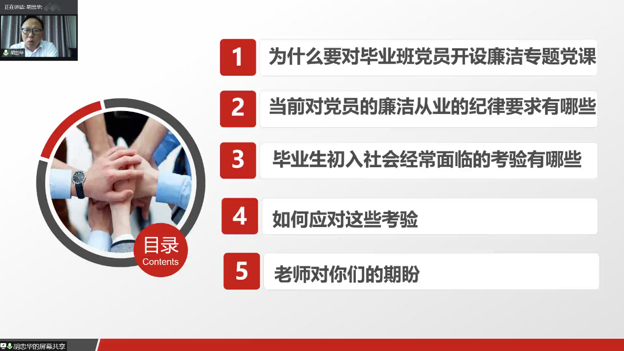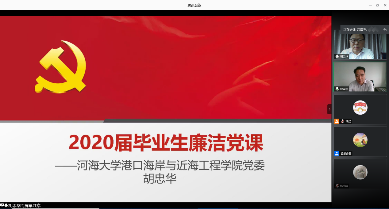 为引导毕业生形成崇尚法治、廉洁自律、爱岗敬业的职业观念,港航北京赛车PK10 于2020年6月18日以线上会议的形式面向2020届毕业生开展廉洁党课。会议由港航北京赛车PK10 党委胡忠华书记主讲,沈国军副书记主持。