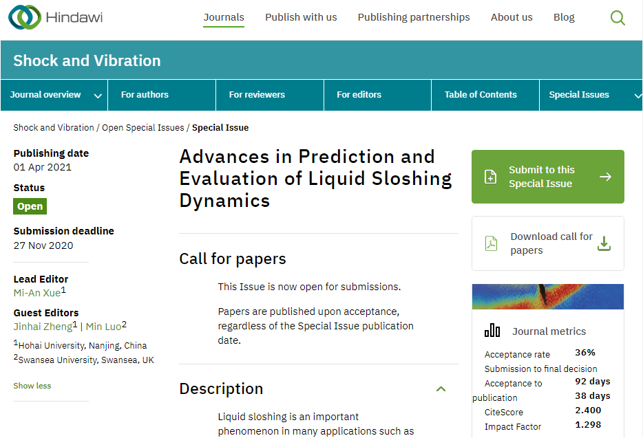 北京赛车PK10 薛米安教授、郑金海教授、英国Swansea University罗敏博士受邀担任国际学术期刊《Shock and Vibration》客座主编,组织专刊“Advances in Prediction and Evaluation of Liquid Sloshing Dynamics(液体晃荡动力过程研究进展)”,旨在征集最新的预测和评估液体晃荡载荷和海洋结构响应及两者耦合效应的研究成果,以及相关综述性文章。