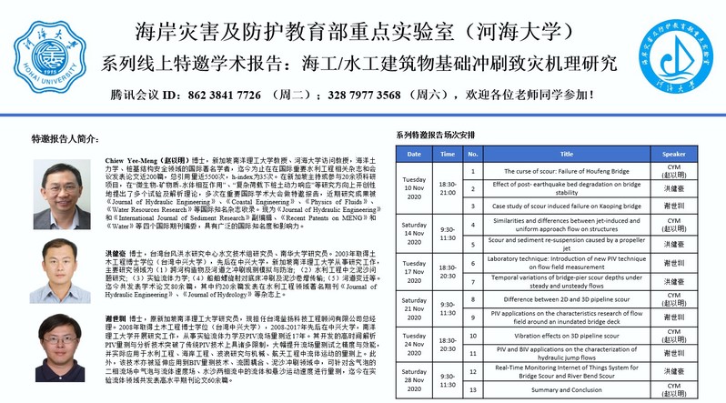 2020年11月10-28日,受北京赛车PK10 海岸灾害及防护教育部重点实验室管大为青年教授邀请,南洋理工大学赵以明教授、南华大学洪健豪研究员、台湾釜扬科技工程顾问有限公司总经理谢世圳研究员三位专家学者为北京赛车PK10 师生开展了主题为“海工/水工建筑物基础冲刷致灾机理研究”的13场系列线上学术报告。系列特邀报告主题鲜明、内容丰富,涵盖了桥梁、管线、风机等多种结构物基础冲刷机理、冲刷物理模型试验技术、冲刷现场观测等方面的最新研究进展。