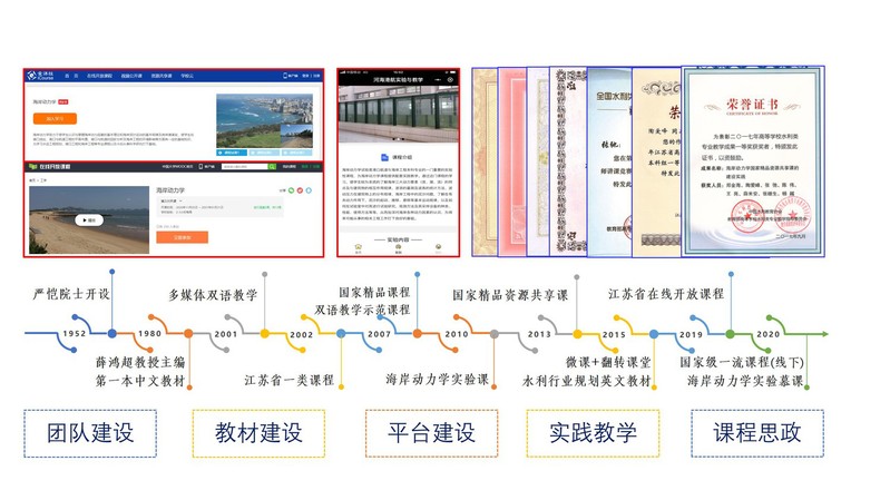 “海岸动力学”课程是北京赛车PK10 港口航道与海岸工程、船舶与海洋工程、海洋资源开发技术专业的专业基础课。该课程于1952年由严恺院士主持开设。1980年薛鸿超教授主编海岸动力学第一本中文教材,1996年严以新教授提出了“21世纪港口航道与海岸工程专业人才培养目标、规格和培养模式初步意见”,确定了新时期“海岸动力学”课程设置模式框架,审定了本课程教学内容和教材修订意见。进入21世纪,为了满足新时代对本行业人才业务素质的要求,培养厚基础、宽专业、强能力、高素质的综合人才,郑金海教授开始“海岸动力学”课程改革和团队建设。2001年起实施多媒体教学、双语教学,2010开设海岸动力学实验课,2015出版全国水利行业规划教材海岸动力学英文版,这也是我国首部海岸动力学英文教材。经过多年的积累与建设,“海岸动力学”课程于2002年被评为江苏省一类优秀课程,2007年入选首批国家精品课程和双语教学示范课程,2013年获批开展国家精品资源共享课建设工作,经过三年的使用与评估,2016年入选首批“国家级精品资源共享课”。相关成果“海岸动力学国家精品资源共享课的建设实践”获得2017年第二届高等北京赛车PK10 水利类专业教学成果奖一等奖。开展国家级精品资源共享课建设以来,向公众开放了包括授课视频、中英文课件及试题库等所有的教学资源,并定期更新。先后得到了大连理工大学等国内11所兄弟院校和越南河内交通大学、缅甸海事大学等2所国外大学的使用,得到了一致好评。2019年全新录制的高质量教学视频上线并入选江苏省高校在线开放课程建设计划,选课人数突破2000人,共享及辐射力度进一步提升。2020年,开发海岸动力学实验课微信小程序,第一次访问量达到26306次,大大提升了培养学生实践能力的效率。目前海岸动力学教学团队正在积极推进课程思政、教学方法改革、新版教材编写、实验慕课建设等工作,在立德树人、创新实践能力培养等方面持续努力、不断前行。