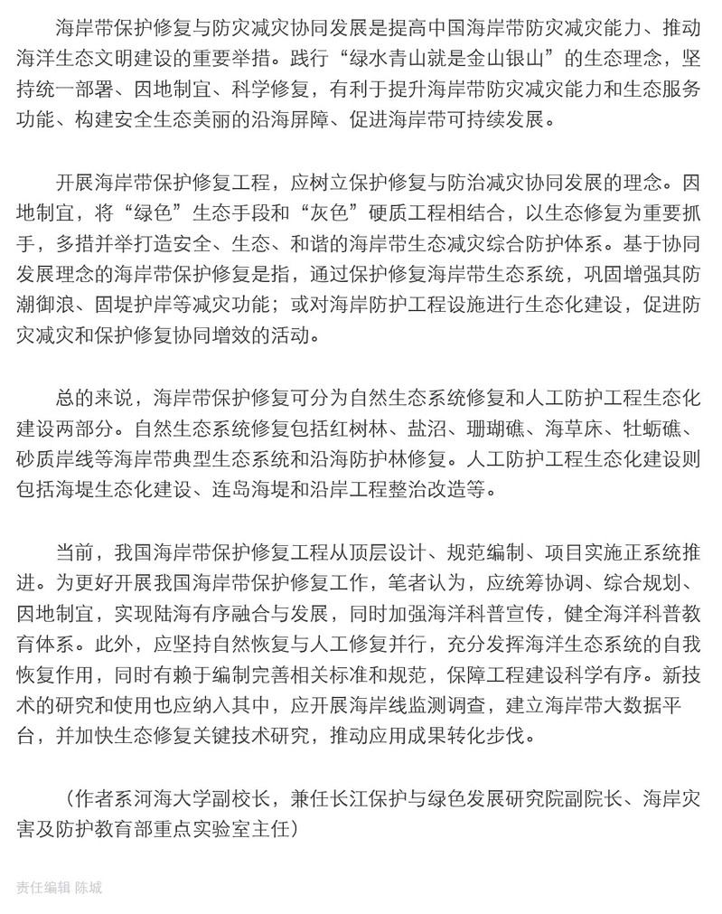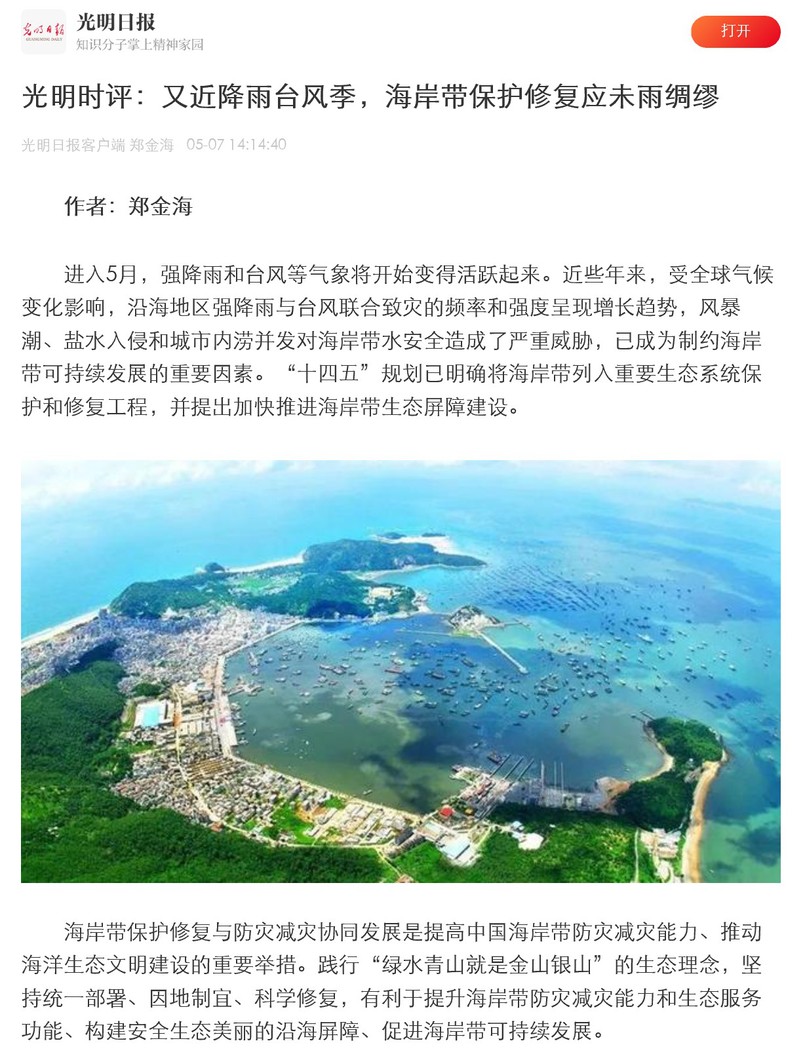 2021年05月07日,北京赛车PK10 郑金海教授在《光明日报》的时评栏目,发表题为《光明时评:又近降雨台风季,海岸带保护修复应未雨绸缪》的署名文章。探讨了制约海岸带可持续发展的因素,并提出了我国海岸带保护修复与防灾减灾协同发展的工作建议。全文如下: