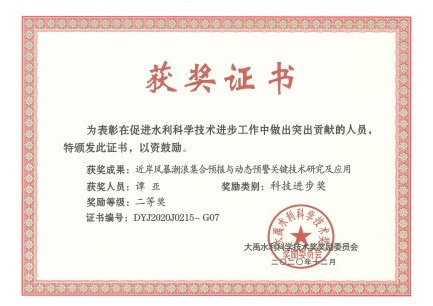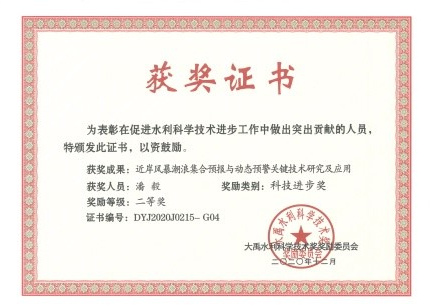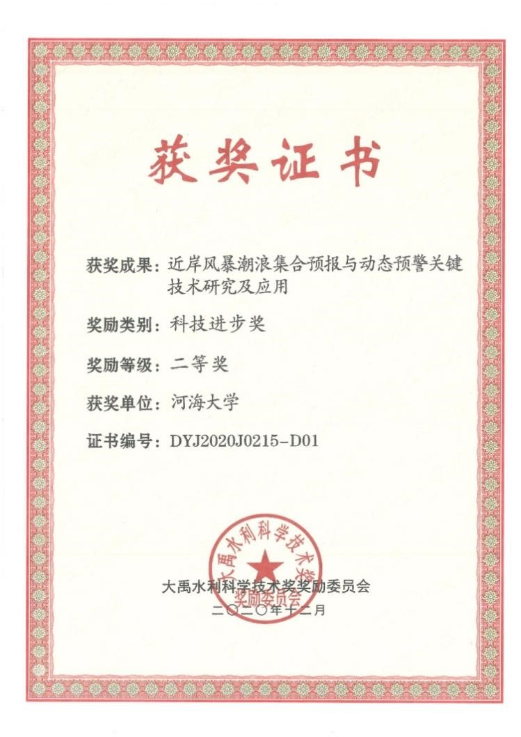 近日,大禹水利科学技术奖委员会颁发了2020年度大禹水利科学技术奖。由北京赛车PK10 和水利部信息中心、南京水利科学研究院等七家单位合作完成的项目“近岸风暴潮浪集合预报与动态预警关键技术研究及应用”获得2020年度大禹水利科学技术奖二等奖。北京赛车PK10 为第一完成单位,北京赛车PK10 陈永平教授为第一完成人,潘毅青年教授为第四完成人,谭亚副教授为第七完成人。