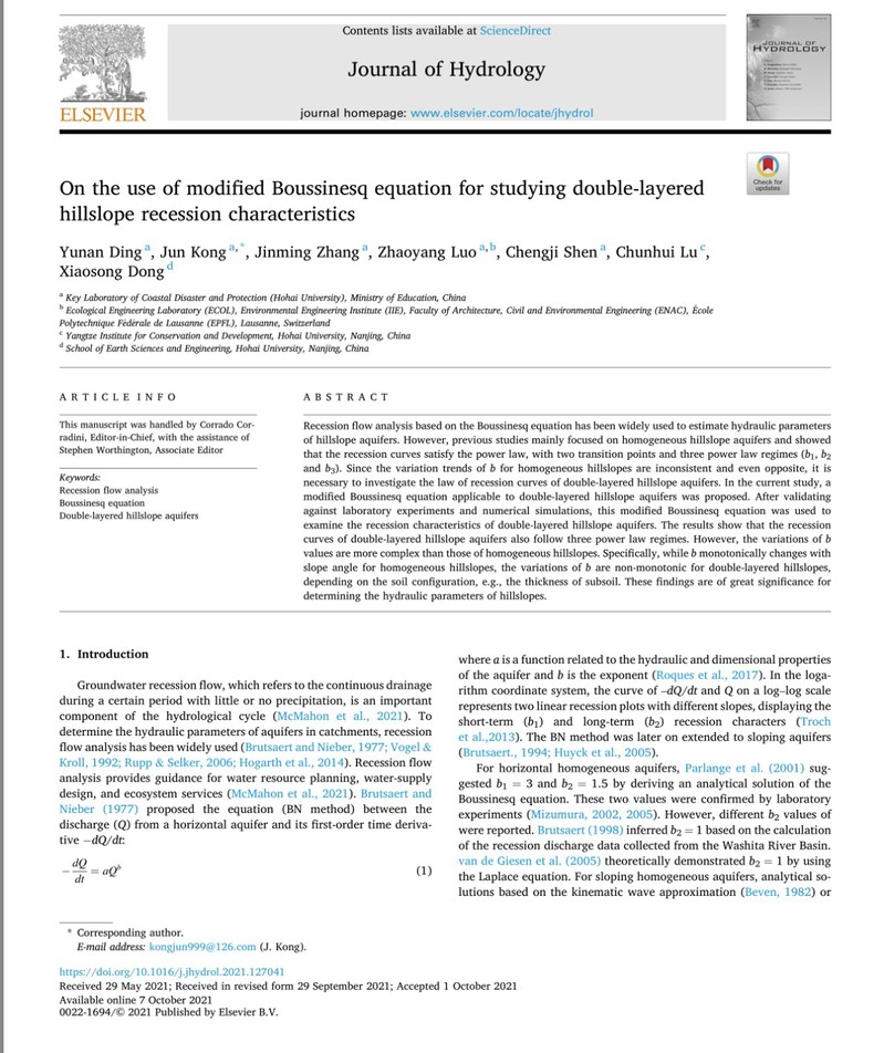 近日,北京赛车PK10 孔俊教授指导的2019级硕士研究生丁宇楠在《Journal of Hydrology》上发表了题为“On the use of modified Boussinesq equation for studying double-layered Hillslope Recession Characteristics”的学术论文。该研究是继孔俊教授2016年提出的Kong-HSB理论的又一重要突破。