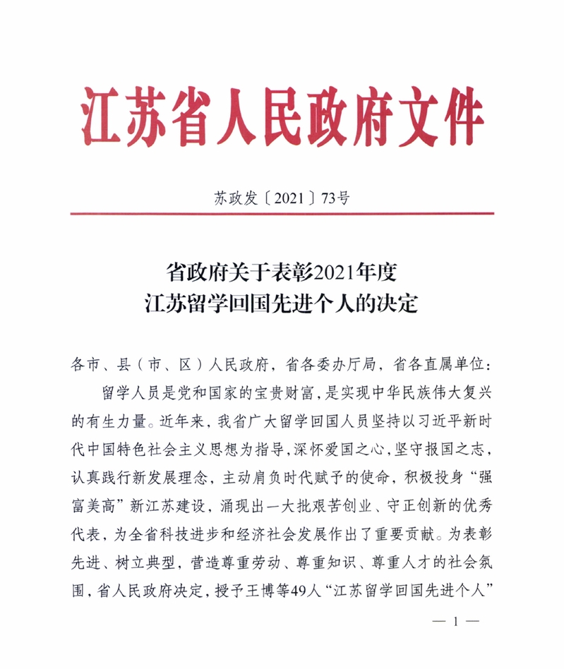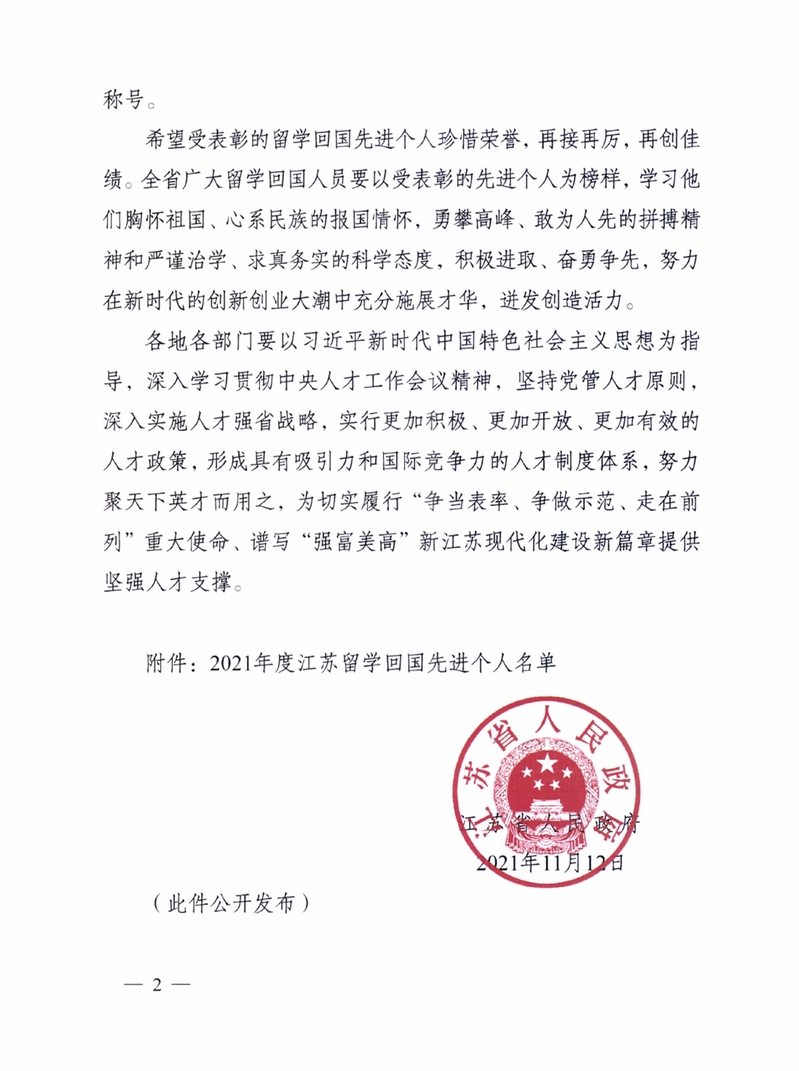 11月12日,江苏省人民政府发布《省政府关于表彰2021年度江苏留学回国先进个人的决定》(苏政发【2021】73号),授予郑金海教授“江苏留学回国先进个人”荣誉称号,表彰其作为留学人员代表为科技进步和经济社会发展作出的重要贡献。