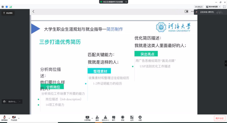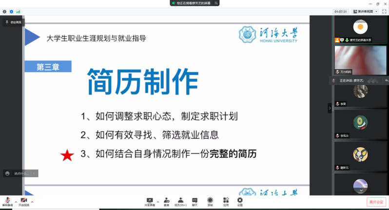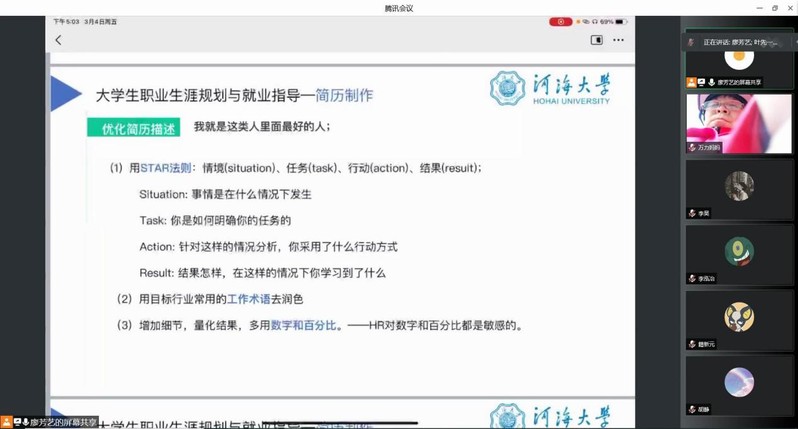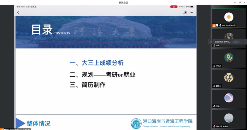 2022年3月4日下午,港航北京赛车PK10 2019级在线上开展职业生涯规划和简历制作培训会。大会由2019级本科生辅导员廖芳艺主持,2019级全体学生及家长参加本次大会。廖芳艺老师就年级整体学习情况、大三学年生涯规划、简历制作培训进行分享。