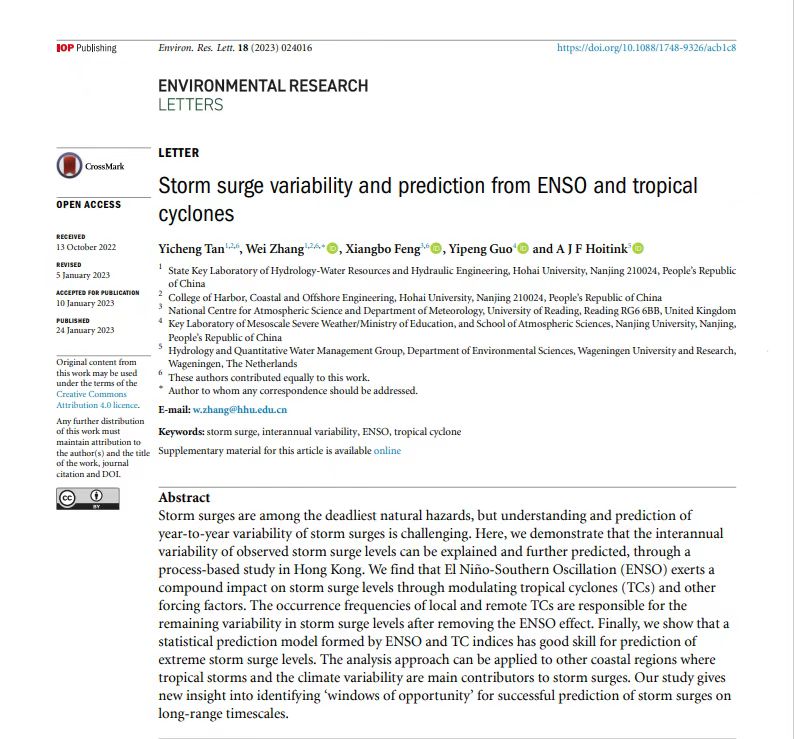近日,北京赛车PK10 张蔚教授和英国雷丁大学冯向波研究员以及荷兰瓦格宁根大学Hoitink教授联合指导的2020级博士研究生谭易成在国际权威学术期刊ERL(Environmental Research Letters)(JCR一区,影响因子6.94)上发表了题为“Storm surge variability and prediction from ENSO and tropical cyclones”的学术论文。该研究成果得到了国家重点研发计划“粤港澳大湾区衍生复合灾害评估与应急避险关键技术”的资助,是张蔚教授研究团队近3年来在河口海岸防洪减灾方向发表的又一重要学术进展,为后续展开海陆交互“多碰头”情况下复合洪水灾害研究提供了基础。