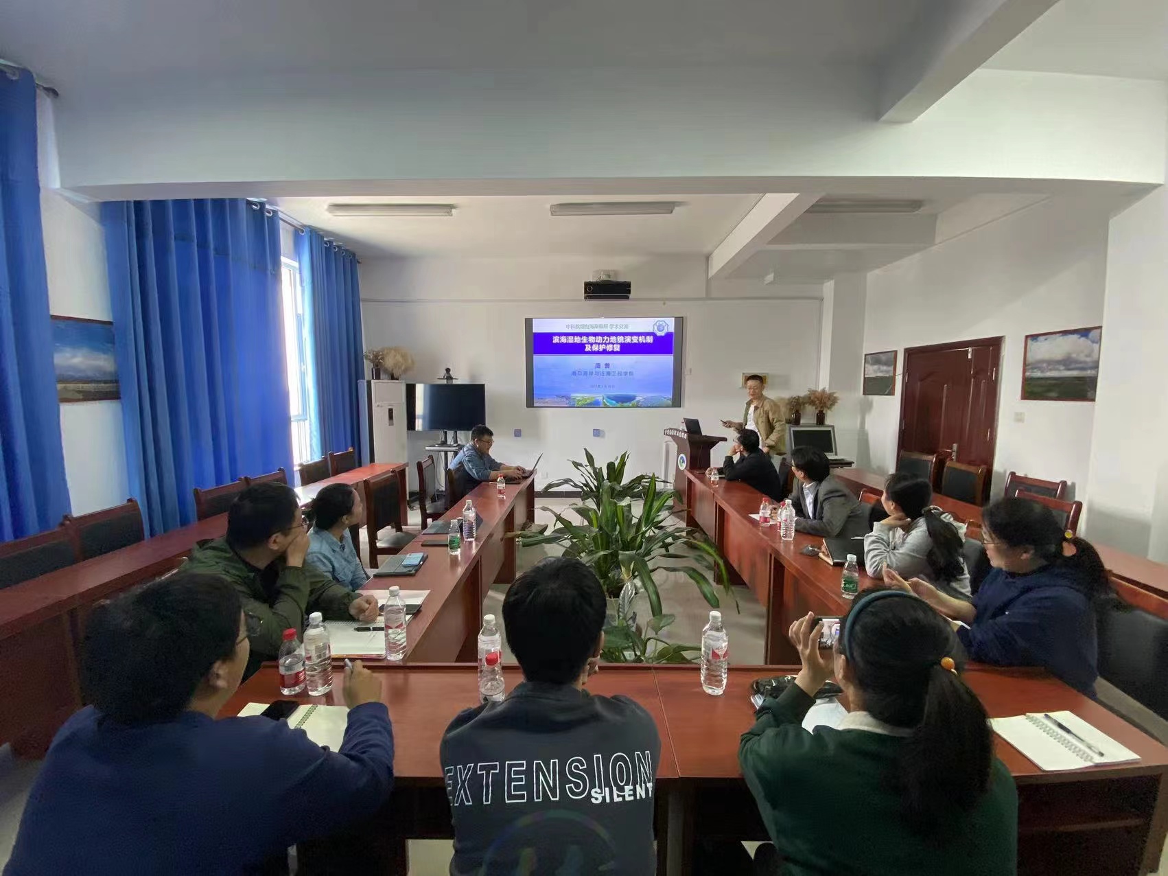 中国科北京赛车PK10 烟台海岸带研究所副所长、黄河三角洲站站长韩广轩研究员、副站长李培广副研究员、谢宝华副研究员等人对北京赛车PK10 师生的到来表示热烈欢迎,并带领参观了站内基础设施建设和野外控制试验平台,陪同考察了黄河三角洲自然保护区。在调研交流期间,双方开展了学术研讨与交流会议,韩广轩研究员与周曾教授分别作了题为“黄河三角洲湿地生态保护与修复”和“河口海岸生物动力地貌过程与保护修复”的报告。张荷悦、曹浩冰、耿亮三名博士后以及谷玉先、潘思齐、张晓天博士生也分别作了学术报告,并听取了韩广轩研究员等老师的研究建议。