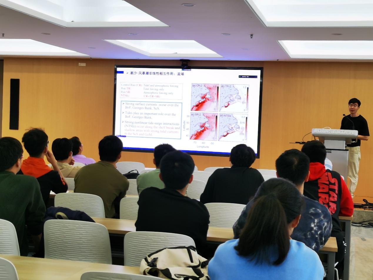 报告结束后,杨盛牧博士与参会师生就“中尺度涡垂向结构”、“中尺度涡与黑潮相互作用”和“核污水穿越黑潮的概率”以及“污染物溯源”等问题进行了深入探讨,取得了良好的学术交流效果。