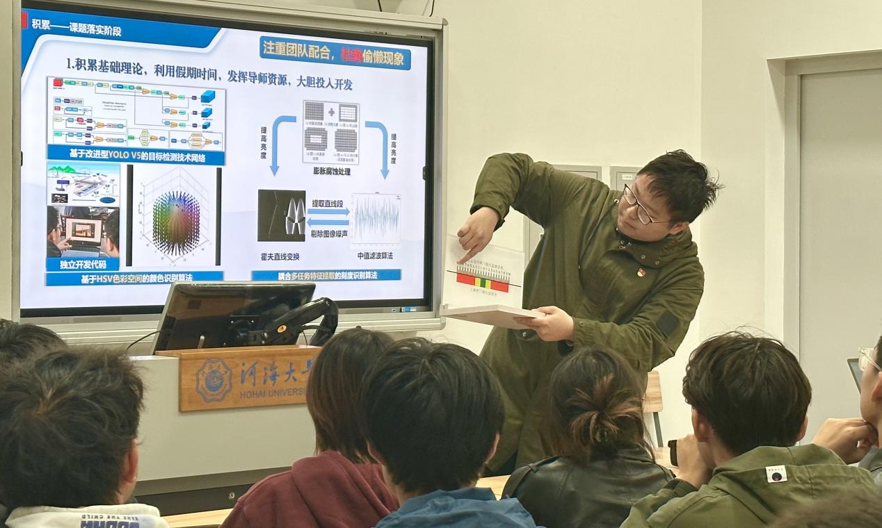 方琳涛首先介绍了自己参与创训项目的经历,鼓励同学们在课题落实中积累基础理论、注重团队配合、转化项目成果,分享了其参与高水平竞赛的经验体会,激励同学们勇于提升能力、攻克困难。