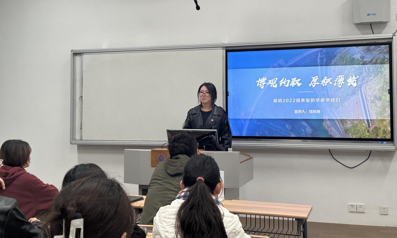 姚秋雨向同学们分享了自己在规划学涯中的心得体会,讲解了各课程学习的注意点和学习方法,罗列了同学们针对升学、出国等不同目标可以选择的目标高校和相关准备,交流了在校期间开展社会工作、社会实践、公益服务的经历。