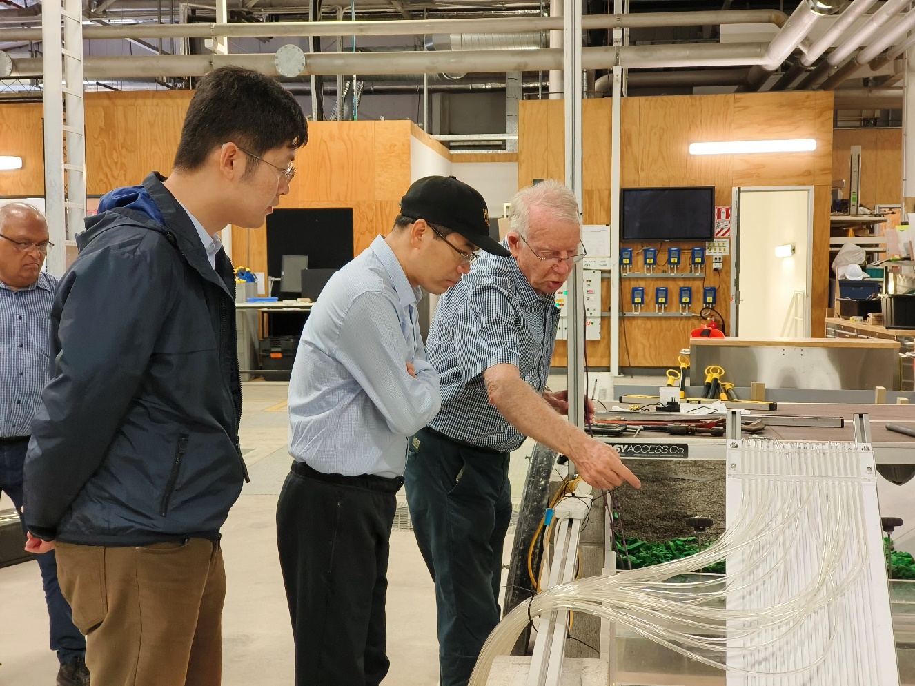 项目负责人郑金海教授,国际合作专家新西兰奥克兰大学Bruce Melville教授、Naresh Singhal教授、Assad Shamseldin教授,课题负责人管大为教授、贺瑞教授及参与项目研究工作的奥克兰大学博士生现场出席了研讨会。新加坡南洋理工大学Yee Meng Chiew教授,澳大利亚格里菲斯大学Dong-Sheng Jeng教授、课题负责人张继生教授及外校项目课题负责人江苏大学成亮教授及相关研究生在线上参加了会议。项目组分别深入交流了“微生物加固饱和海洋原位沙土过程机理及其注浆工艺优化”“复杂动力荷载作用下微生物固化单桩基础抗冲刷机理”“微生物加固对单桩基础强度、刚度影响规律及机制”“复杂动力荷载作用下微生物加固大直径单桩基础防护方法优化”等4个课题的研究内容、进展等,确立了各课题下一年度研究计划与工作方案,为2024年研究工作的顺利开展奠定了良好基础。此外,项目组还参观了奥克兰大学水力学实验室,并开展了微生物加固桩基抗冲刷试验典型工况试验。