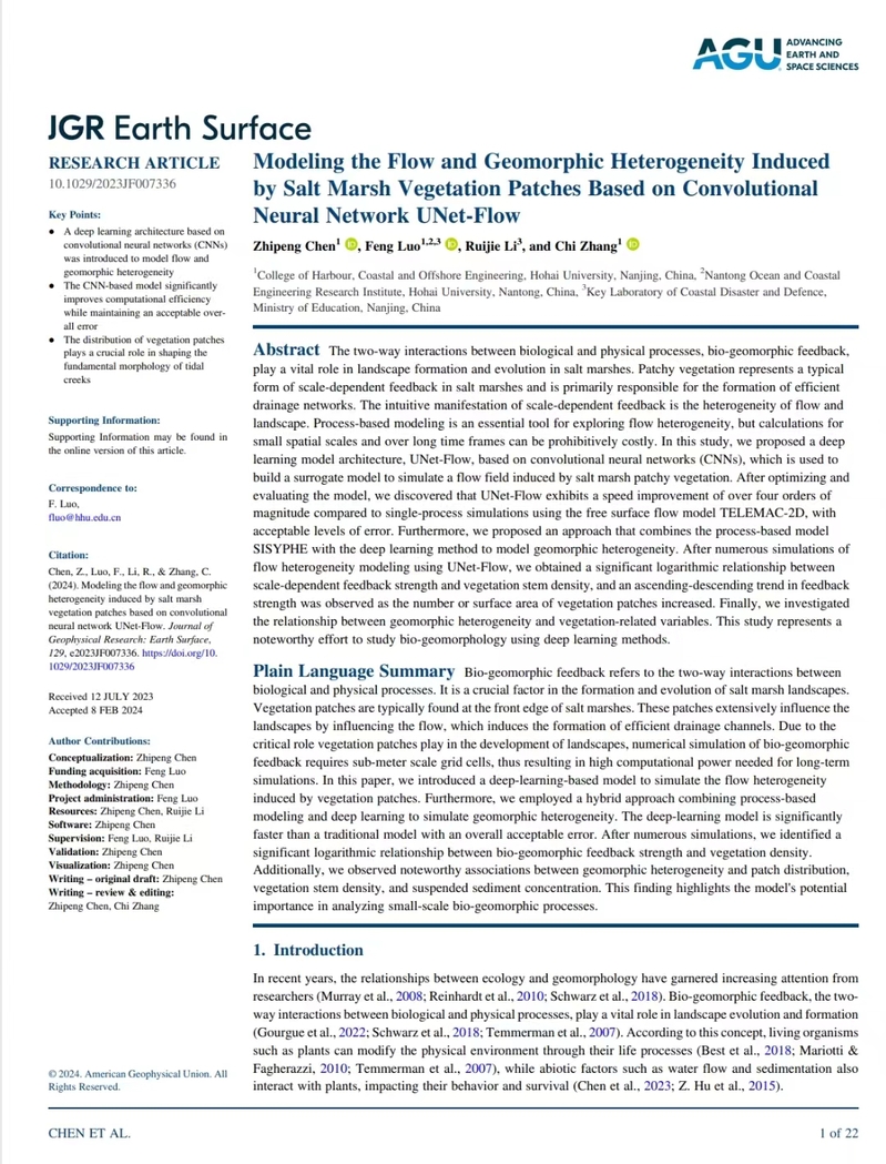Chen, Z., Luo F*., Li, R., Zhang, C. Modeling the Flow and Geomorphic Heterogeneity Induced by Salt Marsh Vegetation Patches Based on Convolutional Neural Network UNet-Flow[J]. Journal of Geophysical Research: Earth Surface, 2024, 129, e2023JF007336. doi: //doi.org/10.1029/2023JF007336