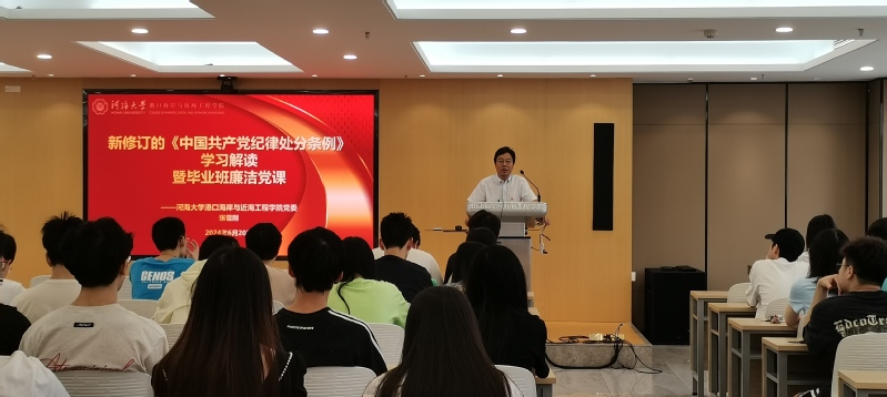 党委书记张雪刚以“新修订的《中国共产党纪律处分条例》学习解读暨毕业班廉洁党课”为题,从三方面讲授专题党课:一是《条例》学习解读,通过回顾党的纪律建设历程,深刻认识开展党纪学习教育的目标要求;学习习近平总书记关于加强党的纪律建设重要论述,强调进入新时代以来,习近平总书记对于加强党的纪律建设的高度重视,体现了中国共产党不断自我革新、永葆活力的决心与行动;从六大纪律及相关处置条例切入,解读《中国共产党纪律处分条例》,分析《条例》的历史沿革、科学内涵、实践要求。二是廉洁自律要求,围绕加强廉政理论学习、提高反腐倡廉能力,严格心里底线、坚守反腐倡廉原则展开阐述,通过毕业生初入职场抵制各类诱惑、坚守初心的实际案例,教育毕业生党员廉洁修身、廉洁从业。三是老师对同学们的期盼,以“坚守规则、敬畏权力;坚守孝道、关爱亲人;坚守友情、桃花潭水;低调做人、牢记感恩;身心健康、前程似锦”寄语毕业生党员。