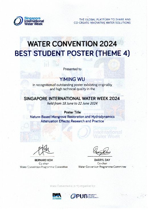 在会议期间,吴一鸣博士生在报告主题四“未来城市与海岸防洪韧性”提交的题为“Nature-Based Mangrove Restoration and Hydrodynamics Attenuation Effects: Research and Practice”的海报获得“最佳学生海报”奖。