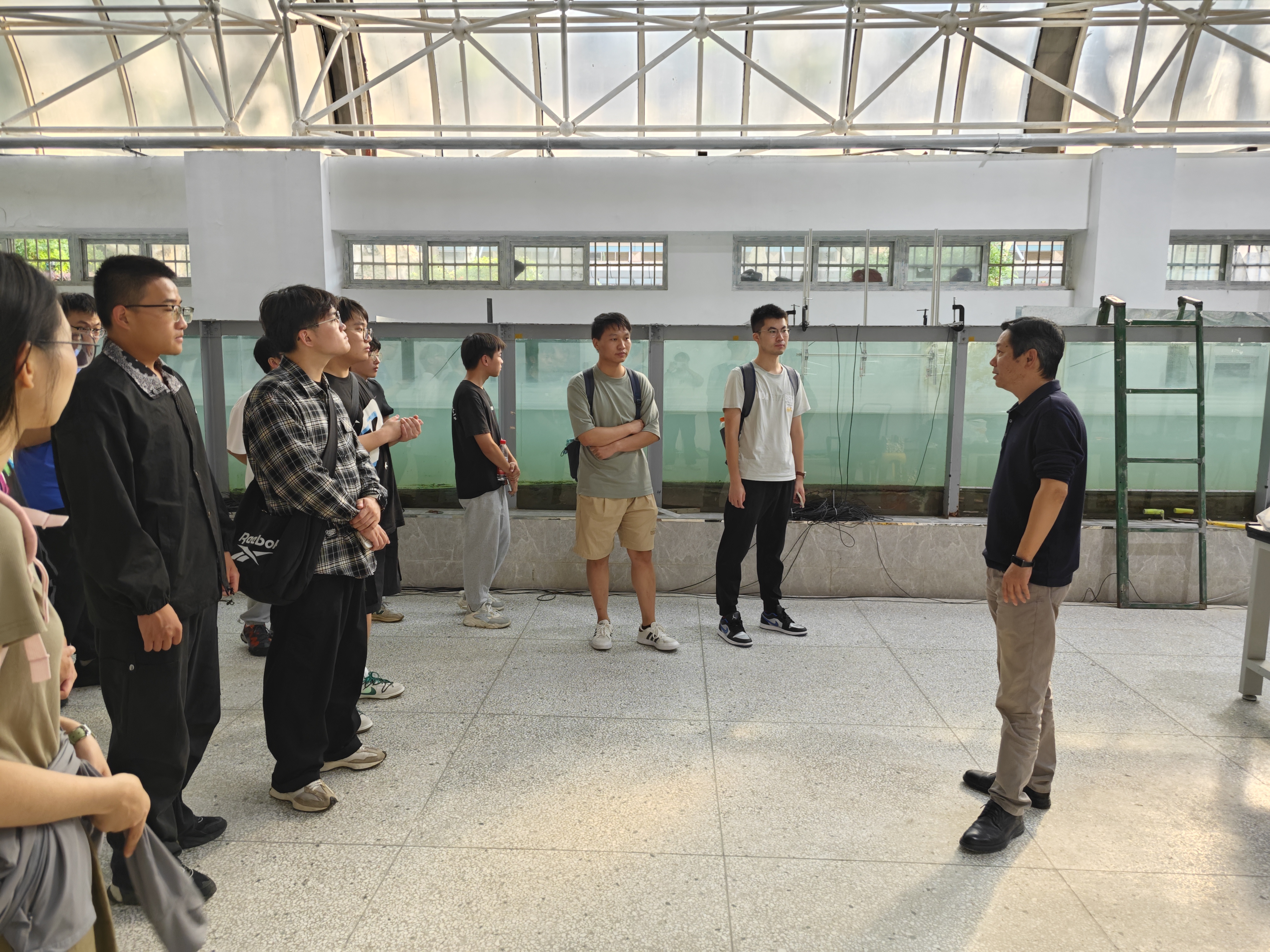 最后同学们移步至港建楼实验室观看港池模型、波浪水槽实验演示,讲解老师向大家介绍了各种物理模型在实际项目中的应用,并分享了水动力实验的研究方法及处理实验数据的方式,为同学们未来的科研提供了思路。