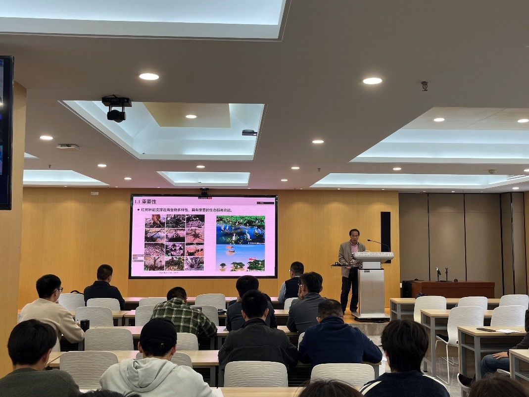 戴志军研究员介绍了广西红树林区的侵蚀现状和红树林人工定植修复工程。“一年生、二年死、三年死光光”描述了红树林成活率极低的现状。通过对不同省份数十个人工定植红树林区域的长期观测,戴志军研究员领衔的研究团队发现红树林根系受到损害是成活率低的主要原因之一,进而提出了本地红树林胚胎大钵育苗、根系无损移植、聚集定植的营林模式,以及可抵御波流联合作用影响的胚胎-幼苗栽培模式,以具体案例的形式介绍了系列成果在我国多处生态修复工程的转化应用。