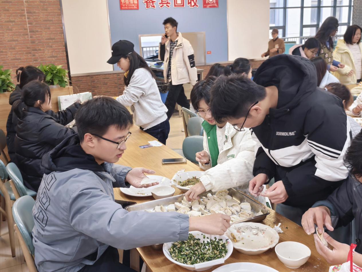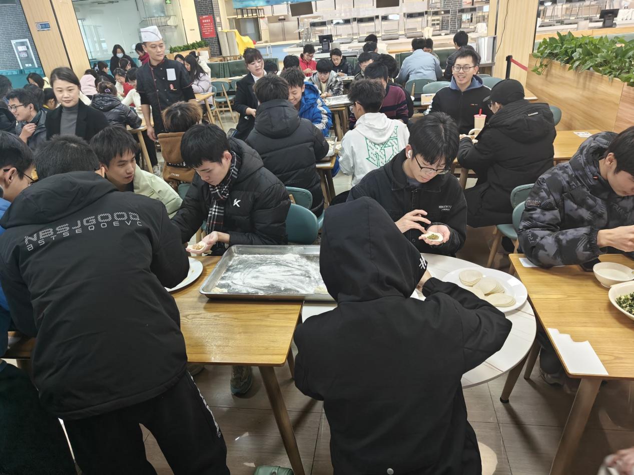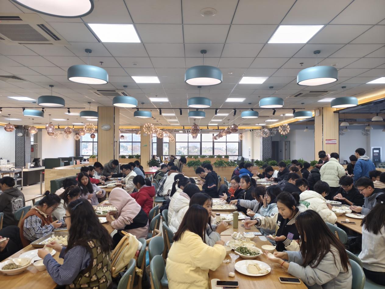 活动当天下午,食堂内早早地布置一新,准备好的饺子馅、饺子皮、擀面杖等食材和工具整齐地摆放着,空气中弥漫着淡淡的面粉香,节日的氛围愈发浓厚。百余名大一学生纷纷踊跃参与,大家齐聚一堂,脸上洋溢着喜悦与期待。与此同时,在常州校区分会场,23级本科生和24级研究生也一起参与了一场别开生面的“包”住幸福、冬至同欢联谊活动。