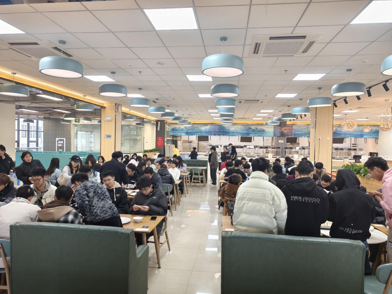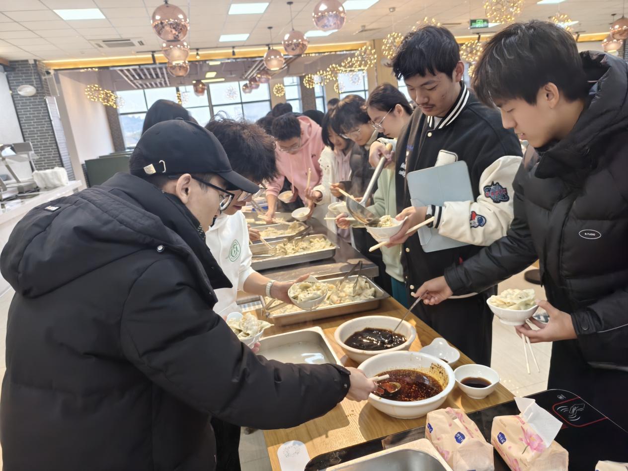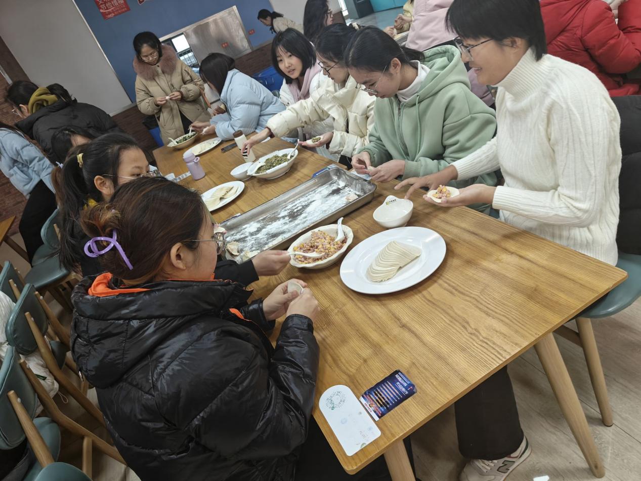 活动当天下午,食堂内早早地布置一新,准备好的饺子馅、饺子皮、擀面杖等食材和工具整齐地摆放着,空气中弥漫着淡淡的面粉香,节日的氛围愈发浓厚。百余名大一学生纷纷踊跃参与,大家齐聚一堂,脸上洋溢着喜悦与期待。与此同时,在常州校区分会场,23级本科生和24级研究生也一起参与了一场别开生面的“包”住幸福、冬至同欢联谊活动。