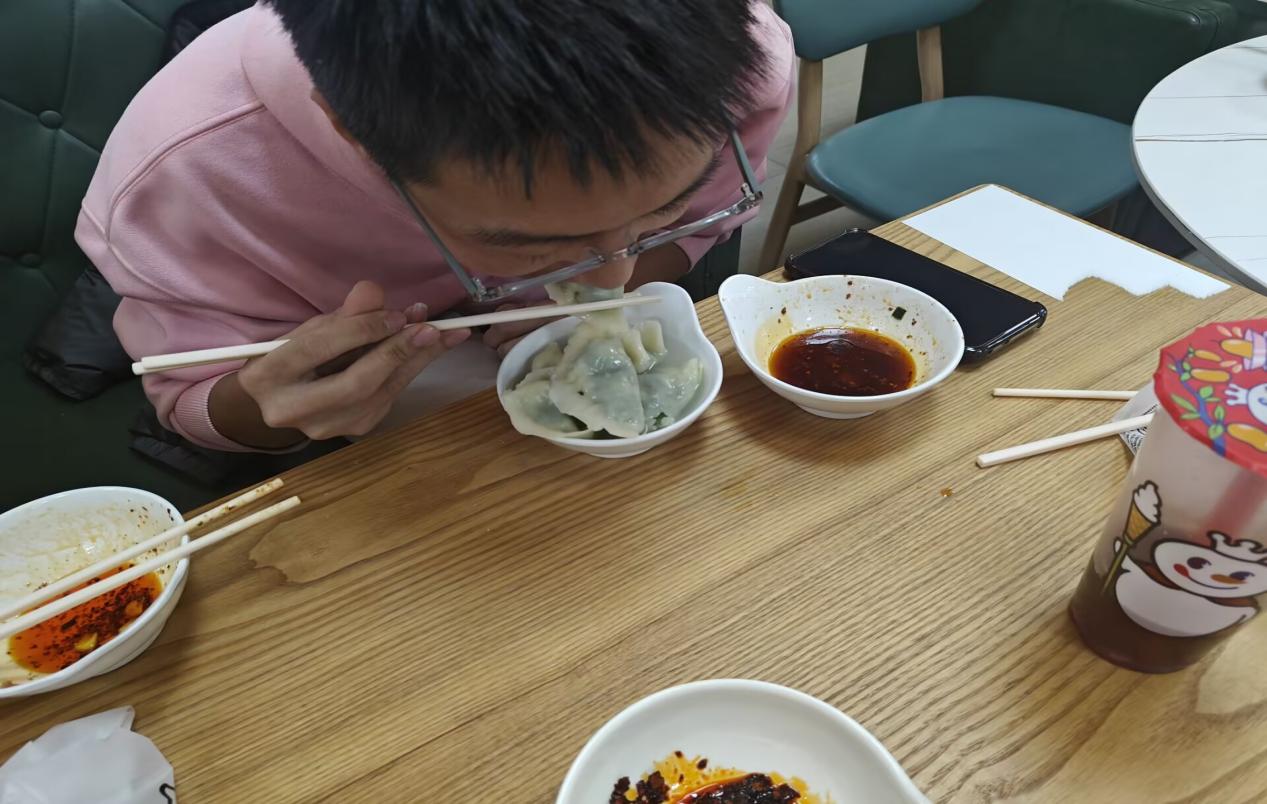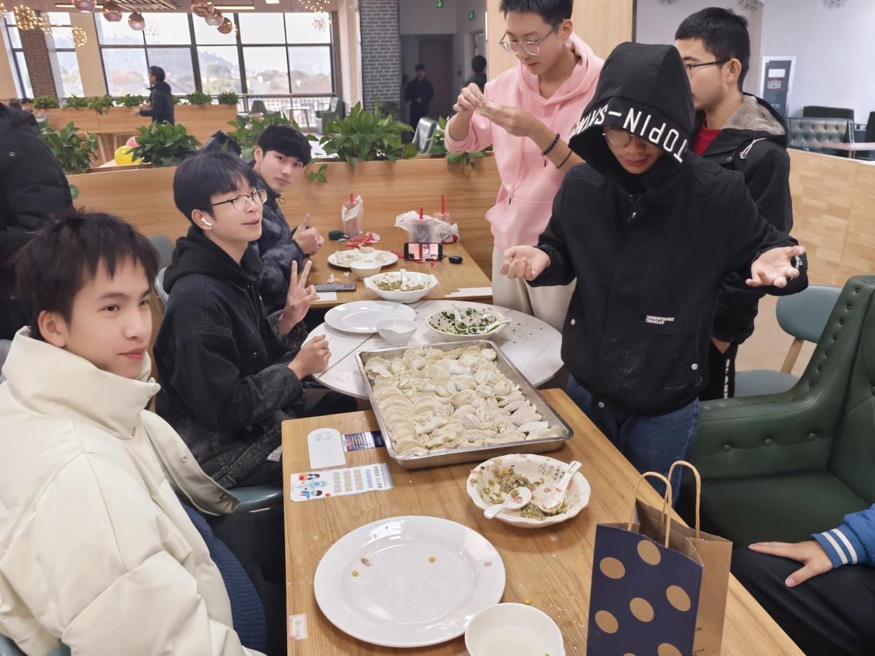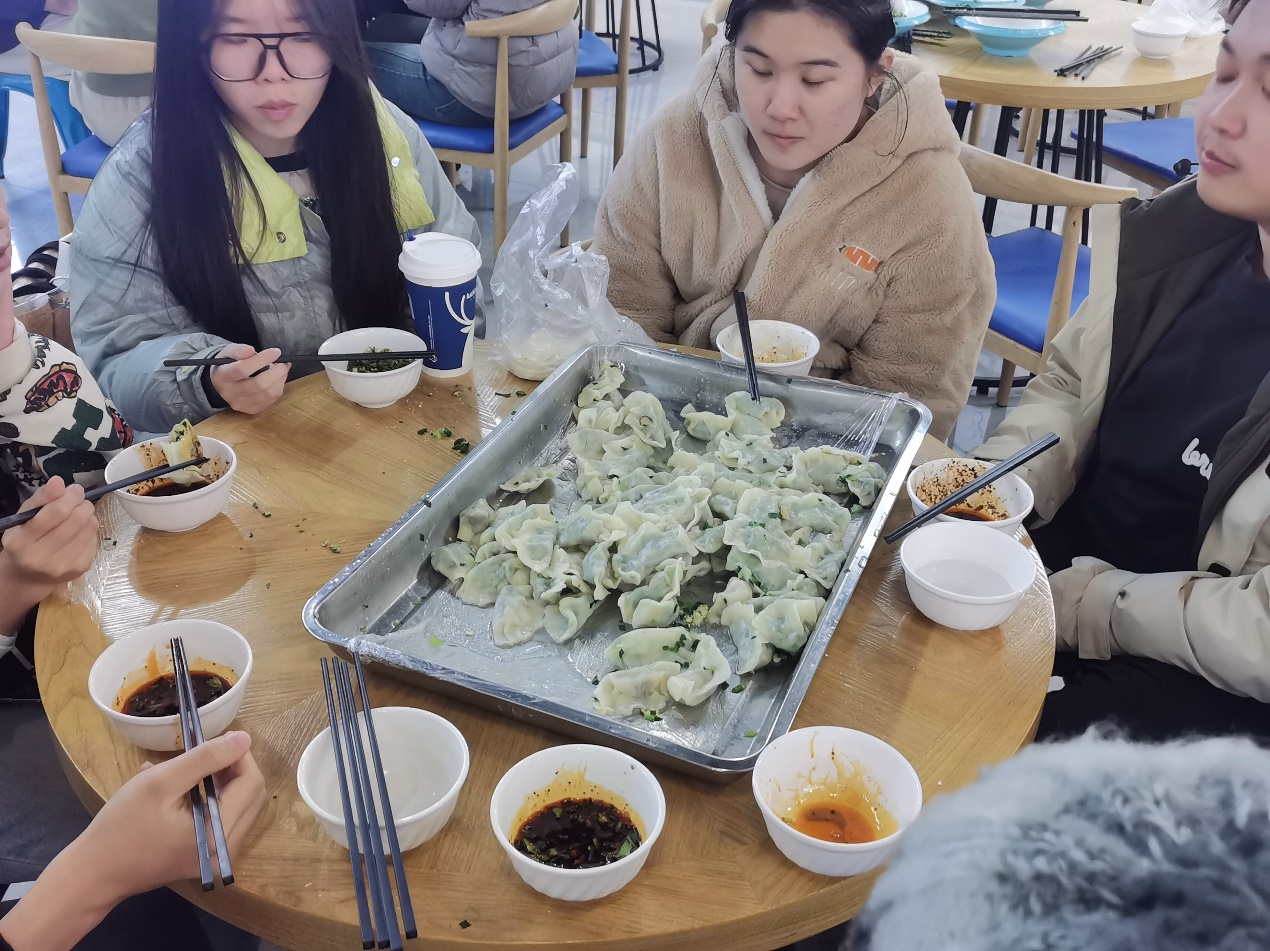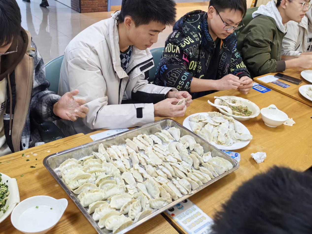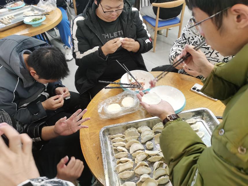活动伊始,几位擅长包饺子的同学率先示范,他们手法娴熟,动作流畅。只见他们拿起一张饺子皮,放上适量的馅料,然后轻轻一捏一折,一个精致饱满的饺子就呈现在大家眼前,引得周围的同学阵阵赞叹。在他们的示范下,其他同学也迫不及待地开始动手尝试。有的同学有一定的包饺子基础,很快就进入了状态,包出的饺子有模有样;而有的同学则是初次尝试,略显生疏,但他们认真学习,逐渐掌握了技巧,包出的饺子也越来越像样。现场欢声笑语不断,大家一边包饺子,一边交流着家乡的冬至习俗和校园生活趣事,气氛十分融洽。